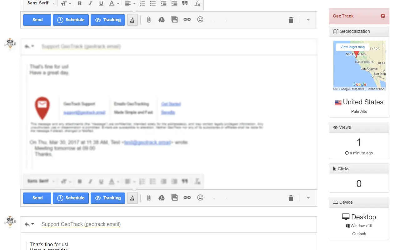 With "GeoTrack for Gmail" Chrome extension, your emails are automatically tracked. As soon as your email is read, we will notify you and provide you with the geolocation of the email opening. You can also track clicks on any links you have included in the body of your message.
